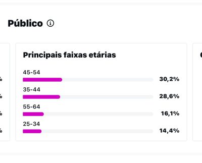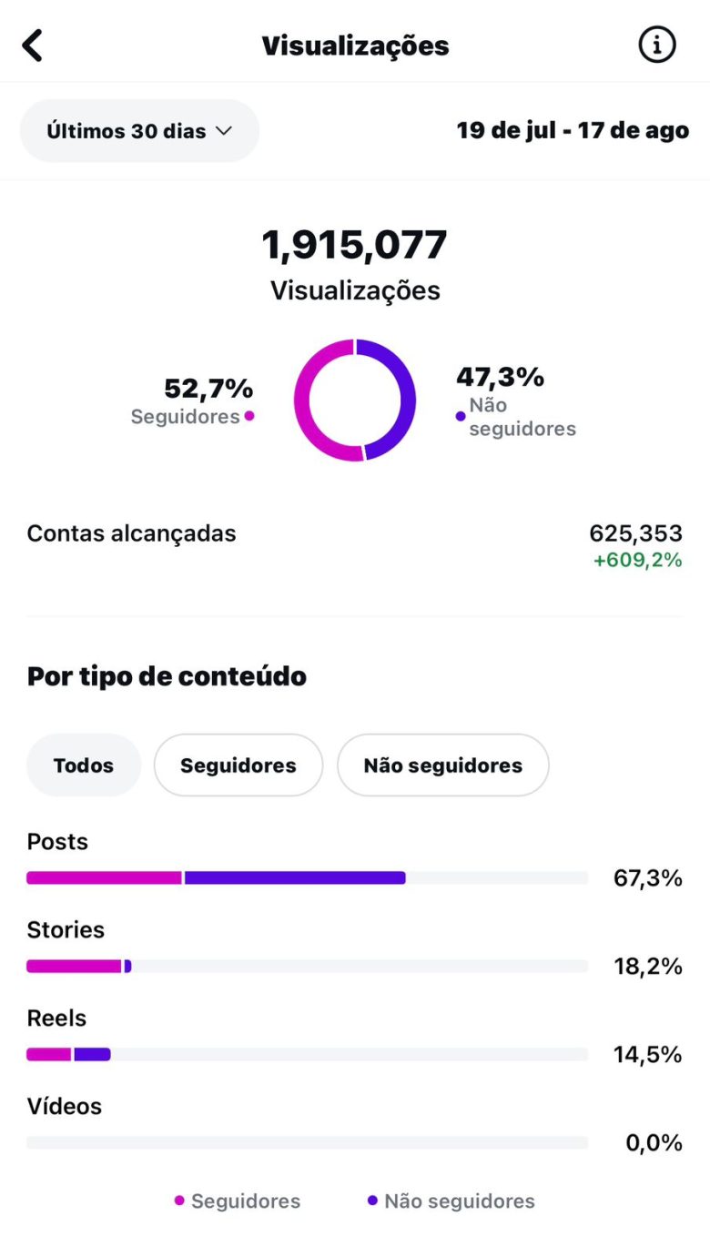 Trata-se do período de 19 de julho a 17 de agosto deste ano. Obtivemos 1.915.077 visualizações e alcançamos 625.353 contas, inclusive com um número relevante de não seguidores. As postagens mais vistas são os posts, seguidas dos stories e dos reels.